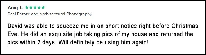 “I have been very impressed with David’s photography skills, customer service, willingness to go above and beyond for a shoot when needed, and his competitive pricing. I have worked with several professional photographers over the years and David is now my go to photographer on all of our listings. I would highly recommend David to any real estate brokers or homeowners that want great photos for their listing or their home!”